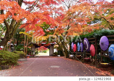 伊豆市 修善寺虹の郷日本庭園の菖蒲門と紅葉と和傘