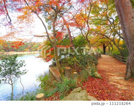 六甲山・再度公園(ふたたびこうえん)、修法が原池(しおがはらいけ)のドウダンツツジの紅葉「日本の歴史