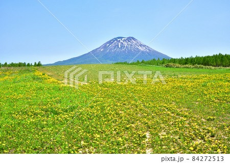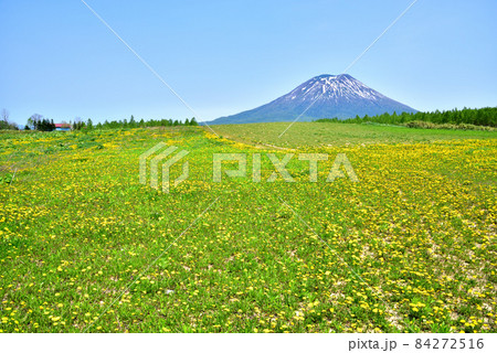 羊蹄山 タンポポ咲き乱れる春の羊蹄山山麓 北海道ニセコ町