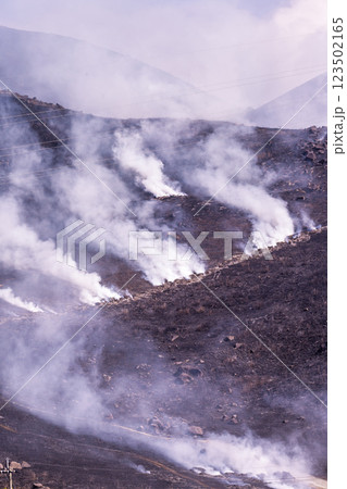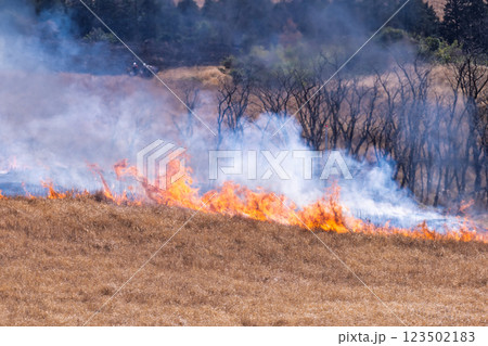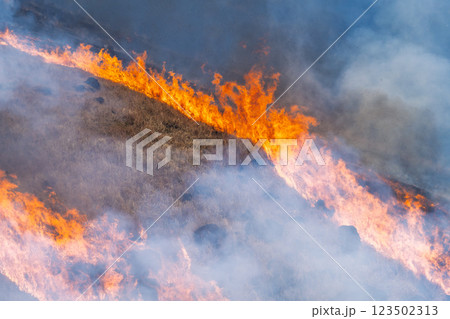 春の風物詩に映える観光・行楽スポット 阿蘇の野焼きクローズアップ風景(俵山)