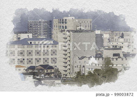 水彩画風 倉敷市街地 倉敷美観地区近くのホテル群 岡山県倉敷市