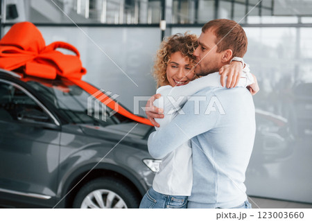 Proor of love. Husband makes gift for his wife. Modern new car