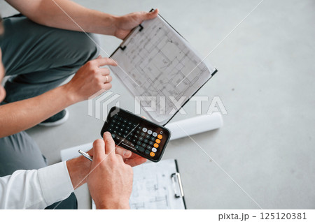 Sitting, using calculator. Manager with foreman are working on the construction site together