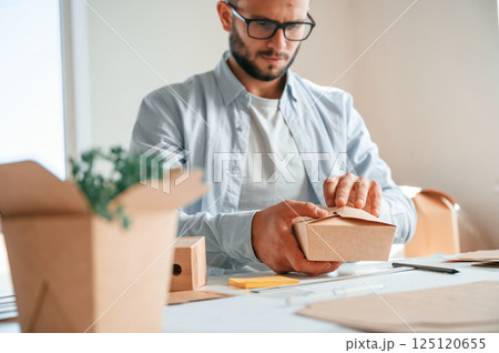 Operating the machine. Handsome man is working at the factory of creating eco boxes