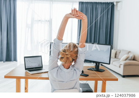 Taking a break. Female stock broker in formal wear is working in the office