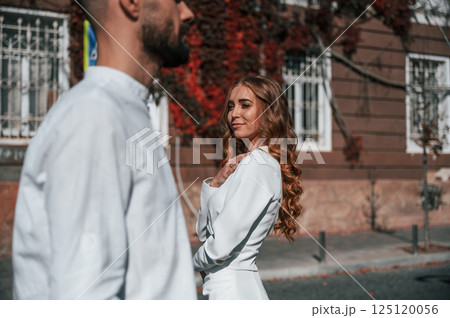 Beautiful young couple is together on the street against old building