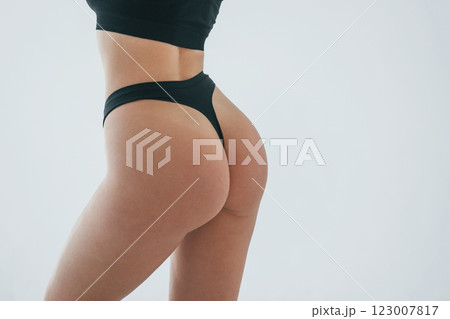 Close up view. Woman in underwear with slim body type is posing in the studio