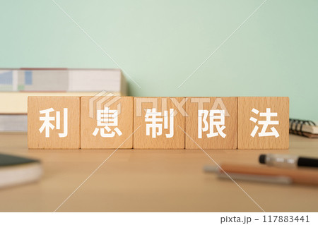 利息制限法の文字が入ったブロック、電卓、スマホ、ノート