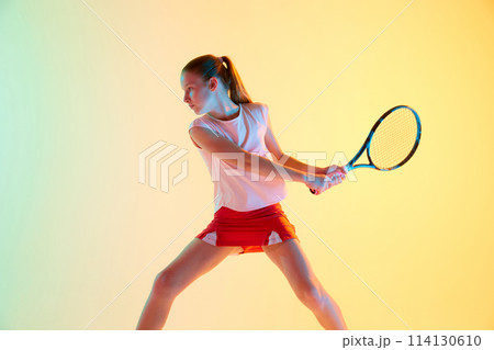 Dynamic portrait of sportive teen girl, tennis player in sports uniform training in action in neon light against blue-yellow background.