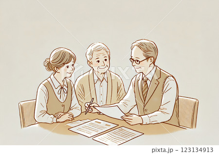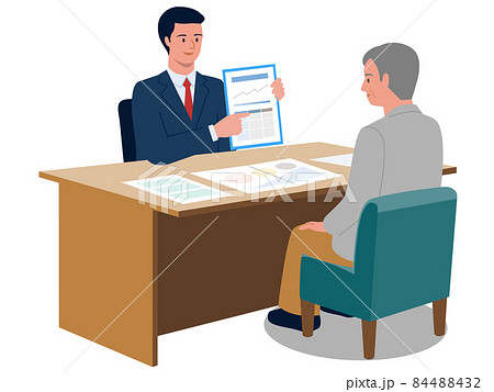専門家にライフプランの説明を聞くシニア世代の夫婦のベクターイラスト