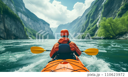 穏やかな氷河水でカヤックを楽しむ一人旅。逆流で上流に登るビジネスマン。AI画像