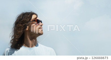 Man with long curly hair waering casual blue tshirt and sunglasses gazes up on cloudy blu sky. Casual blue tshirt complements the serene, thoughtful expression. Banner. Summer. Background for
