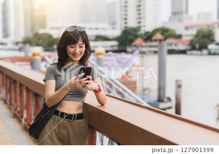 Happy young southeast asian woman teenager blogger world travel explorer using smartphone searching tourism guide. Asia local cultural experience concept at chao phraya river bangkok