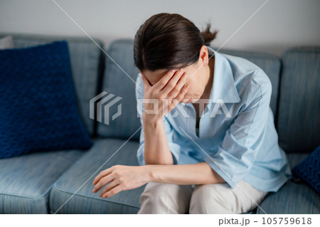 (全身正面)疲れて溜息をつきながらソファでだらけて座る女性
