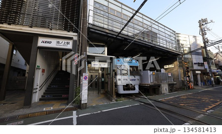 京王井の頭線の池ノ上駅北口、エレベーターが設置され駅ホームに電車が停車中