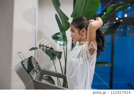 室内のジムのランニングマシンでランニングをする若い女性