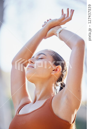 Fitness, health and woman stretching arms in nature to get ready for workout, training and exercise. Sports, thinking and female stretch hands and warm up to start exercising, cardio and running.