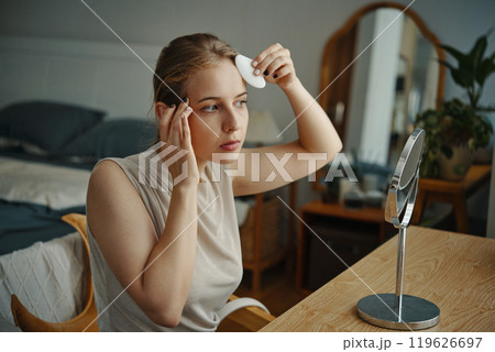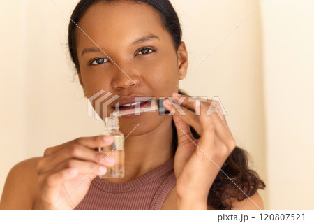 Woman Applying Facial Oil for Natural Skin Care Treatment at Home