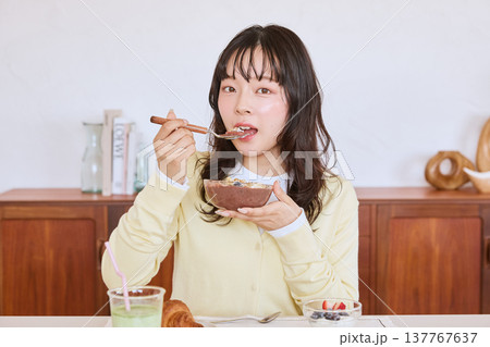 アサイーボウルを食べる若い女性の朝食シーン