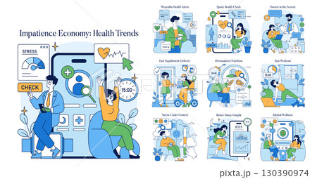 Vector illustration depicting modern health trends such as wearable health alerts, quick health checks, and personalized nutrition. Emphasizes quick service delivery, mental wellness, and stress