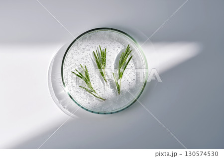 Petri dish with rosemary serum on a white background in the sun with a beautiful shadow..