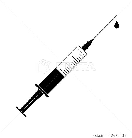 Medical Syringe with Drop. Black and White Vector Illustration of a medical syringe with a visible droplet at the tip of the needle.