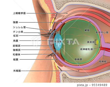 目 眼球 構造 人体 CG 図解 断面図 説明入り