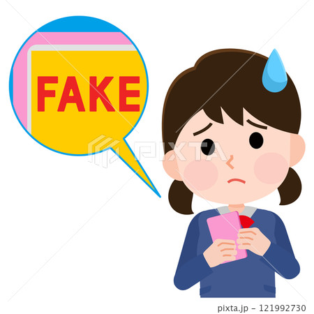 スマホでフェイク画像、フェイク動画を見て困惑する若い女性 イラスト