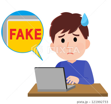 パソコンでフェイク画像、フェイク動画を見て困惑する男性 イラスト