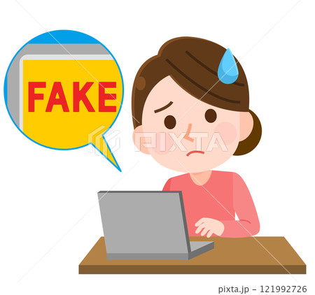 パソコンでフェイク画像、フェイク動画を見て困惑する女性 イラスト