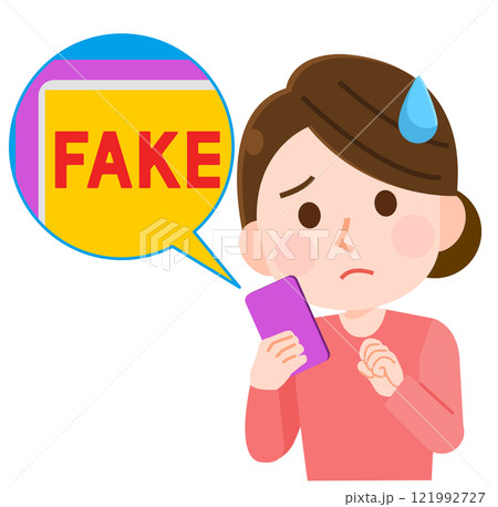 スマホでフェイク画像、フェイク動画を見て困惑する女性 イラスト