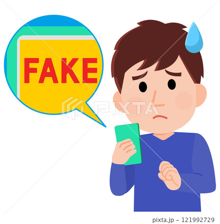 スマホでフェイク画像、フェイク動画を見て困惑する若い男性 イラスト