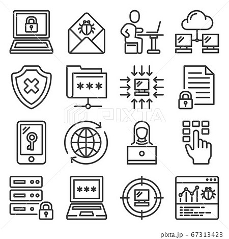 Cyber Attack and Virus Digital Protection Icons. Line Style Vector