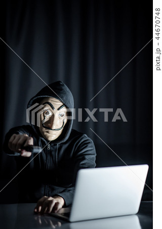 Hoodie hacker holding gun sitting with laptop