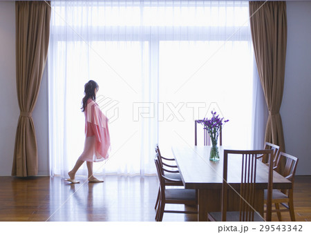 窓際で伸びをする女性の後ろ姿