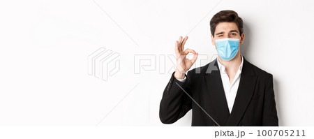 Concept of covid-19, business and social distancing. Close-up of good-looking businessman in trendy suit and medical mask, showing okay sign and winking, standing against white background