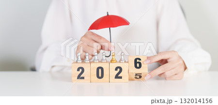 Happy New Year 2026 with hand holding red umbrella cover people chess. life Insurance, health medical, leadership, protection, safety and New year holiday Concepts