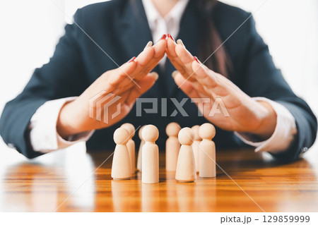 Hands protecting family wooden model for insurance and assurance life concept. Businessman hand gesture protecting wooden domino falling to family dolls for insurance and assurance.