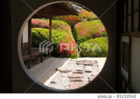 【瀬戸内三十三観音霊場】第十三番 頼久寺 円窓から見たサツキの花が咲く庭園 岡山県高梁市