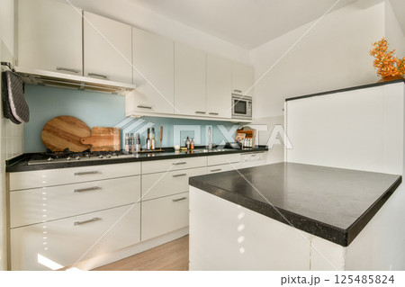 A stylish and contemporary kitchen featuring sleek cabinets, a large countertop, and modern appliances, perfect for culinary enthusiasts and home cooks.