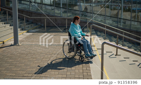 A caucasian woman in a wheelchair cannot go down stairs without a ramp. Hard to access environment.