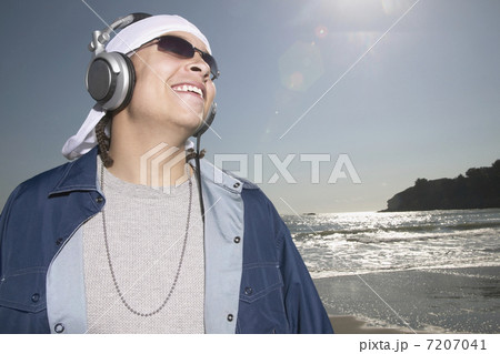ヘッドフォンをつけて音楽を聴く歌う若い女性のクローズアップのイメージ