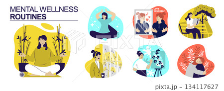 Mental wellness routines concept set for web design. Collection with people meditating, making mindfulness, practice yoga asanas, self acceptance, love yourself, doing hobby. Vector illustration.