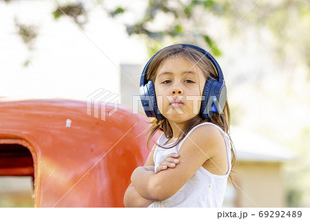 Little girl listening to music with her headphones in the truck