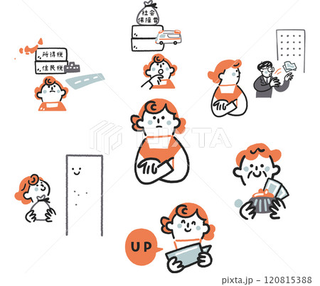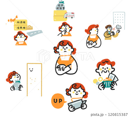 年収の壁と税金、手取り、年金などについて考える非正規雇用の女性 セットのストックイラスト素材