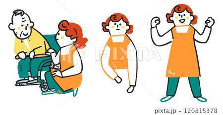 介護職で張りきって働く女性 セットのストックイラスト素材