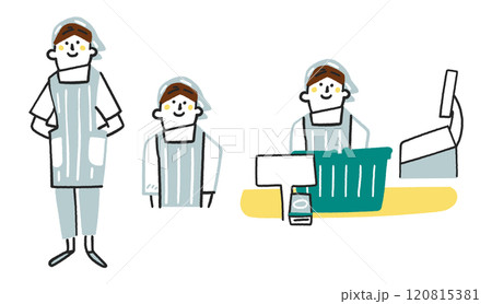 エプロンを着けた調理員またはスーパーマーケットの店員 セットのストックイラスト素材