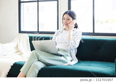 在宅勤務をする若い女性