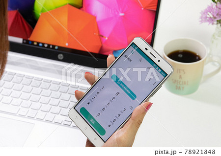 ノートパソコンとコーヒーとスマホと女性の手元