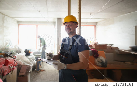 Fifteen-year-old worker fills out paperwork on a construction site indoors